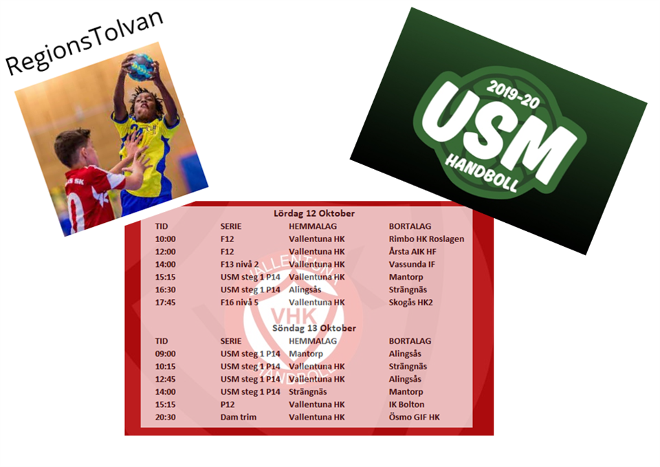 Hej på er! I helgen är det fullspäckat schema i hallen då både regions 12:an F12, seriematcher och framförallt USM P14 Steg 1 spelas. Vi efterlyser extra mycket publik till helgen! Gör gärna en lagaktivitet utav publikhejandet! Ta med er ert bästa humör och kom ner till hallen heja fram våra lag till vinst!!