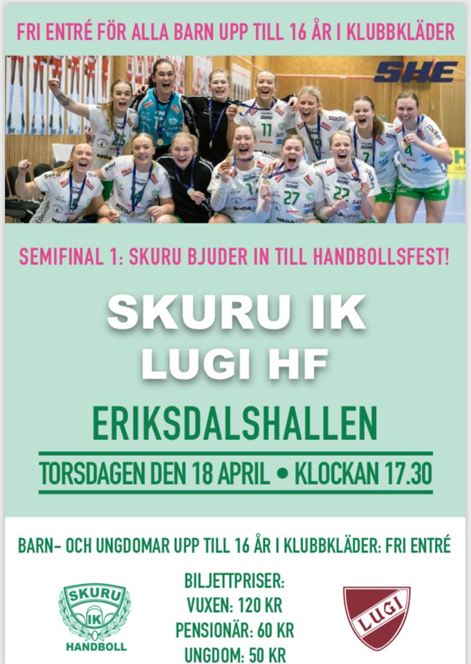 SHE Semifinal 1 Damer SKURU IK - LUGI HF TORSDAGEN DEN 18 APRIL KLOCKAN 17.30 ERIKSDALSHALLEN FRI ENTRÉ FÖR ALLA BARN UPP TILL 16 ÅR I KLUBBKLÄDER