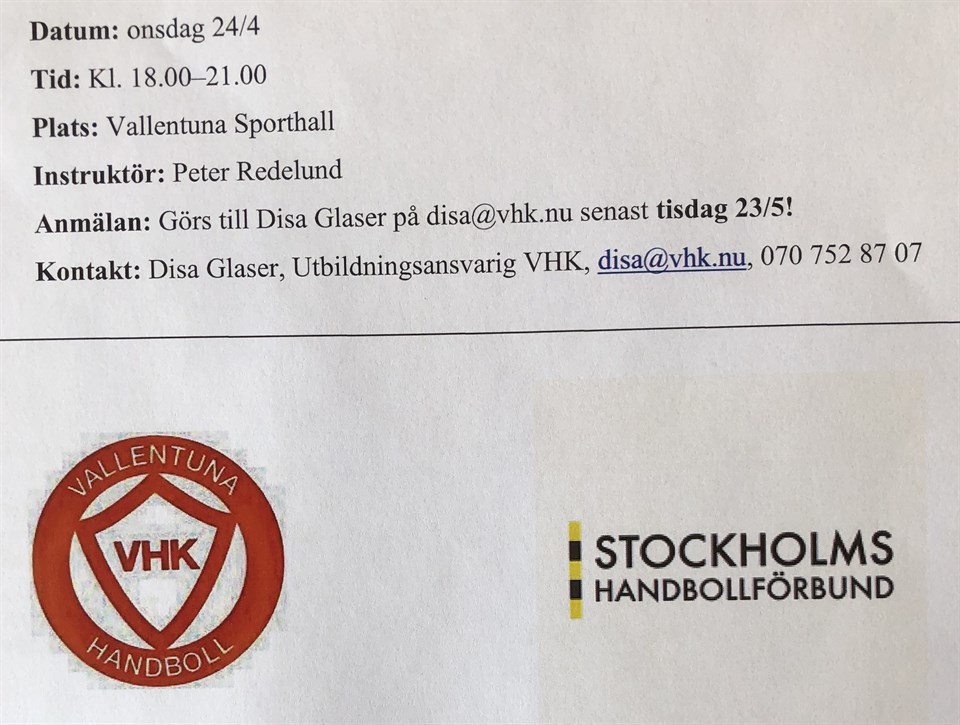 ”Kost för unga idrottare” Kursen är till för dig som är förälder, tränare, ledare eller spelare (U12 och äldre). Platser kvar! Anmälan till Disa@vhk.nu Onsdag 24/4 Kl 18-21 Vallentuna Sporthall