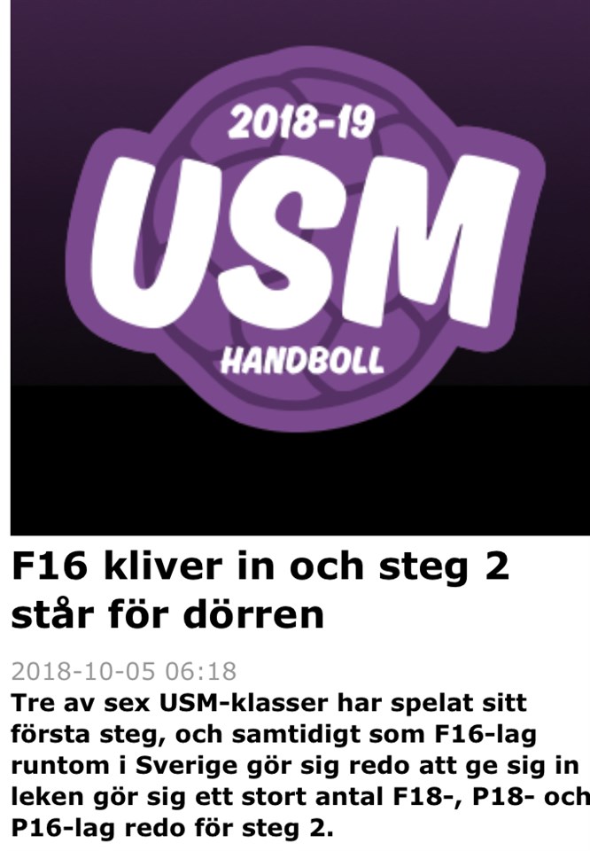 Ni vet väl att ni kan följa USM via Svenska HF:s hemsida? Kolla in: http://www.svenskhandboll.se/USM/Nyheter/F16kliverinochsteg2starfordorren/