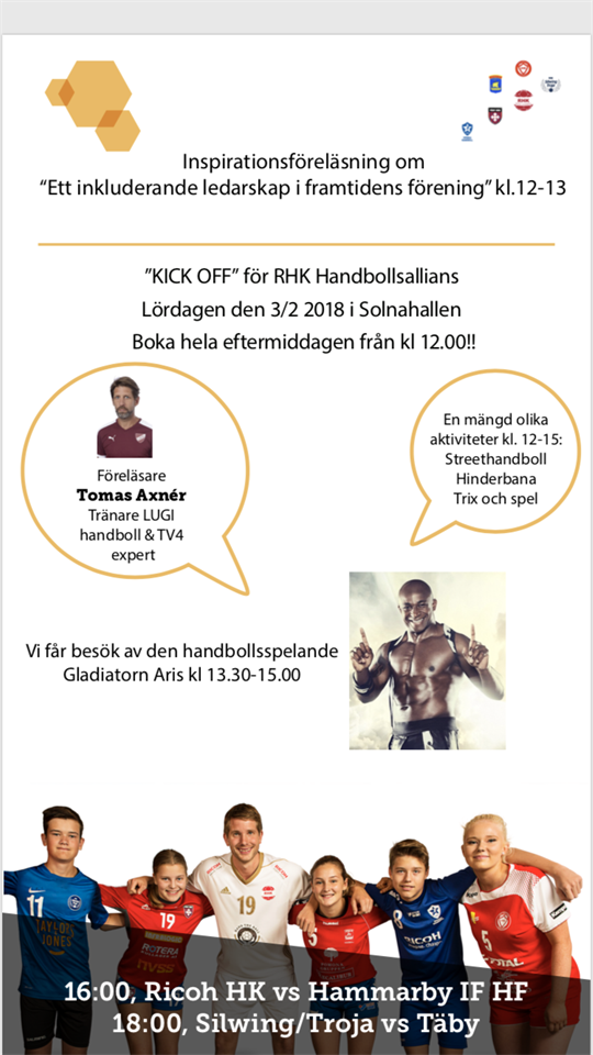 Äntligen är det dags för RHK-alliansens riktiga Kick-Off! Lördagen den 3/2 kl:12-19 ska alla vi alliansföreningar fylla Solnahallen med våra medlemmar! Det blir mängder av aktiviteter i både A- och C-hallen; Streethandboll ”Goalcha!”, strafftävling, speedshooting, trix och tips, hinderbana träffa den handbollspelande Gladiatorn Aris (”Phoenix”) och matcher (Handbollsligan Herrar RHK-HIF kl:16 och Div 1 Herrar Silwing/Troja-Täby kl:18) Vi startar allt med en inspirerande föreläsning med handbolls-Sveriges och Lugis Tomas Axner! Hela dagen är helt gratis & alla medlemmar är välkomna! (Spelare, ledare,tränare och föräldrar) För mer info - se mailen och inbjudan. Kom ihåg att meddela ungefär hur många som kommer från ert lag till annika@vhk.nu