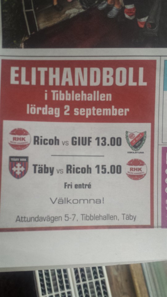 Hej! På lördag 2 september kl 13 spelar Ricoh mot Guif i Tibblehallen. Kl 15 spelar Täby mot Ricoh i samma hall. Fri enre'!