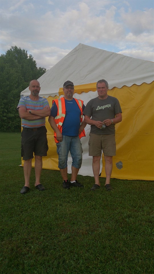 På den vanliga platsen står dem nu, våra gul/vita tält Framför tältet står vi som gjorde det i år: Håkan O, jag & Rolle med det som blev över av silvertejpen i hand :-) Lycka till på Eken nu .............. //Börje